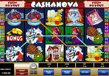 Автомат Казанова состоит из пяти барабанов. На тридцати доступных позициях разыгрывается джекпот в размере 37 500 кредитов. На геймплее представлены хорошо продуманные тематические элементы, в числе которых три символа с расширенными возможностями: