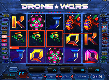 Игровой аппарат Drone Wars, созданный специалистами Microgaming, посвящен популярному научно-фантастическому жанру. Вместо первоклассного трехмерного дизайна разработчики сделали ставку на кинематографию 1950-х годов. В результате получился эффектный микс футуризма и ретро-эстетики. В азартной игре действие происходит в далеком будущем, но правила выдержаны в классическом стиле.