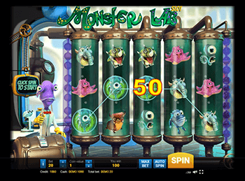 Загляните в таблицу выплат. В ней вы найдете все символы и информацию об их ценности. Как уже упоминалось, практически все картинки слота Monster Lab – разнообразные бактерии. В качестве Дикого символа (Вайлда) выступает решетка ДНК, а Символа разброса (Скаттера) – молекула красного цвета. Она предоставит право на 25 фриспинов. Некоторые получат меньше – 15. Это зависит от количества найденных Скаттеров на мониторе. Все новые игры оснащены бонусной картинкой, которая отправляет в призовую игру на дополнительный экран. На этом слоте функции бонуса выполняет коричневый монстрик с рожками.